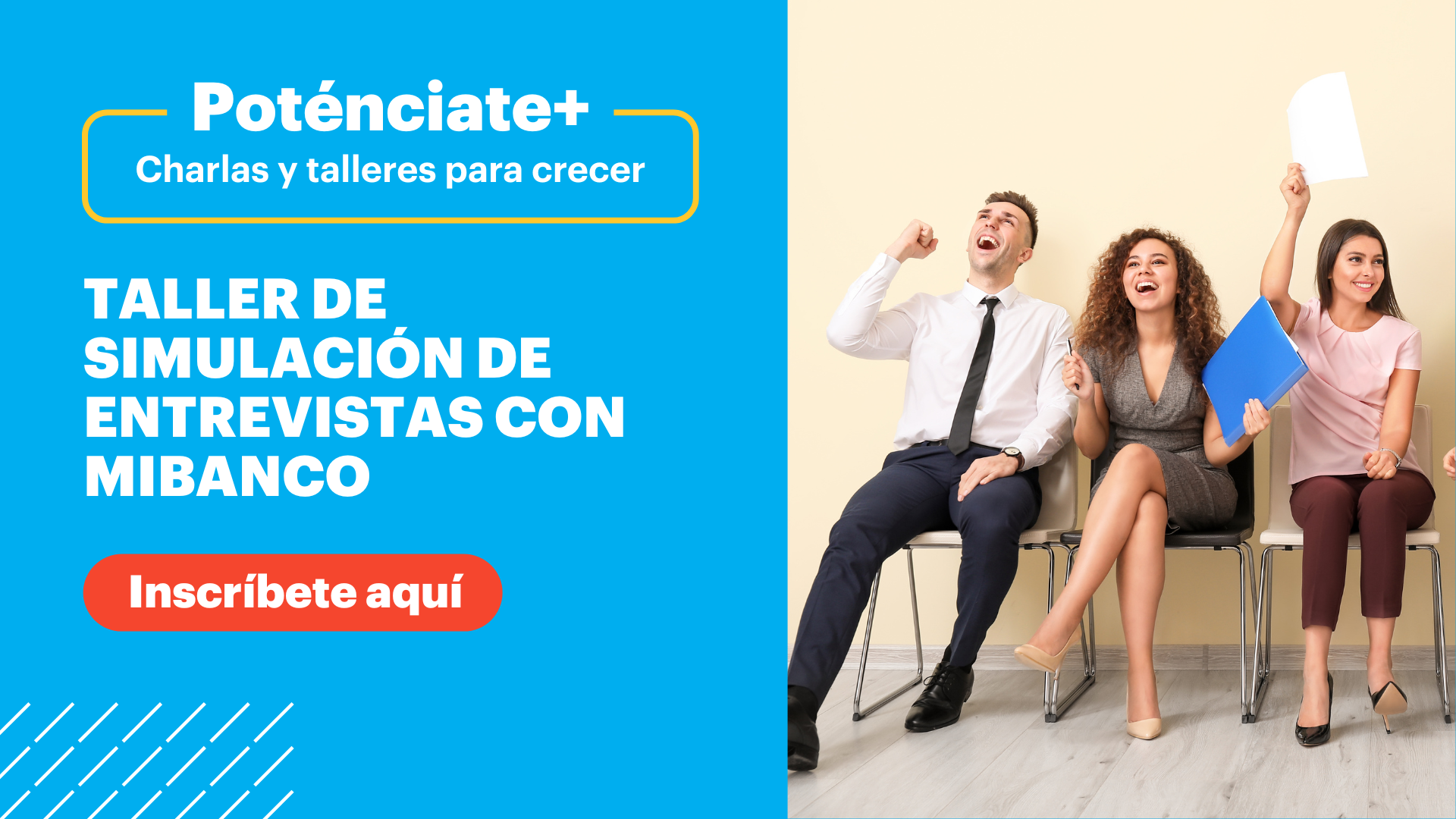 Únete al taller “POTÉNCIATE+: Simulación de entrevistas con MIBANCO” y practica en tiempo real cómo responder con seguridad, comunicar tus logros y proyectar tu mejor versión profesional. Habrá feedback en vivo y tips desde la mirada del reclutador. Ideal para estudiantes y egresados de todas las carreras.
